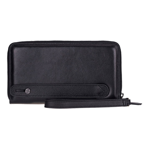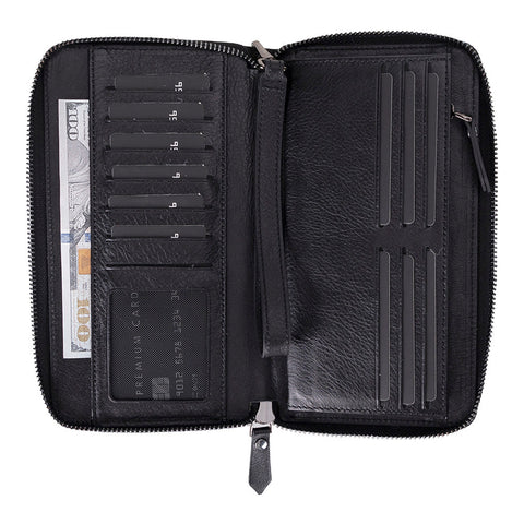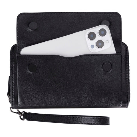 This leather wallet is a stylish one-for-all solution for carrying your phone, cards, cash, and coins. With a magnetic phone holder, 12 card slots, and multiple compartments, it offers convenience and protection. With a wrist strap and hanger loop design, it is suitable for daily carry or travel