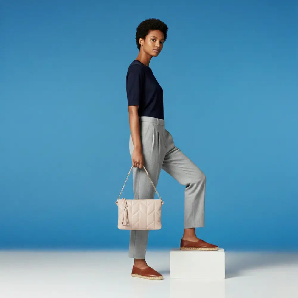 Add a touch of elegance to your day-to-day looks with the Jewel Quilted Shoulder Bag. This lightweight shoulder bag, created from high-quality, genuine leather, boasts a sophisticated, minimalist design coupled with elegant stitching. Additionally, the intricate tassel detail adds to its charm. This elegant accessory is perfect to carry to dinner or any other event that you may attend in the afternoon or evening