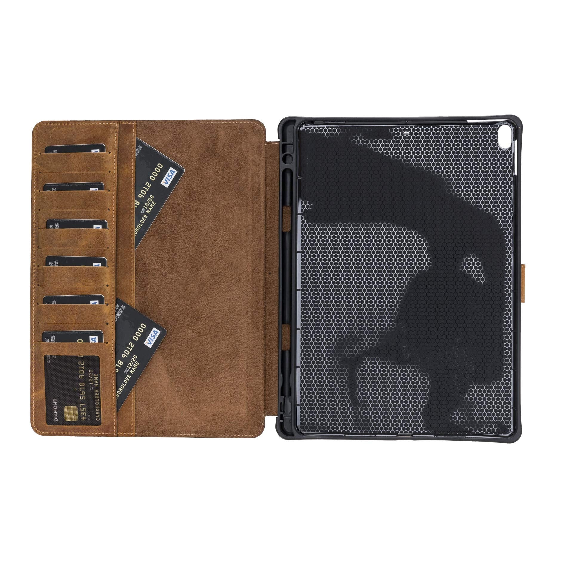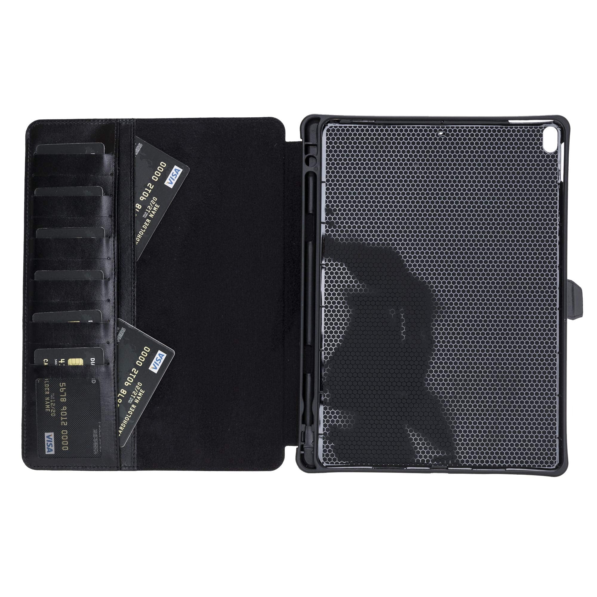 • It is a multi-functional case enriched with a wallet feature by adding 8 inner credit card slots and a transparent ID window along with two inner documents card pockets extending along the entire edge of the tablet to keep notes, cash and cards